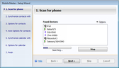 The 1st time you use Mobile Master, you have to connect your mobile/smart phone to your PC. Mobile Master then automatically detects all supported mobile and smart phone models either via cable, infrared or Bluetooth. Every phone is assigned its own profile to make managing several phones possible without creating a chaos of data. An Wizard helps with the settings; even users without technical background knowledge can compare the address book data on their phones with the data on their PC or copy it to a new phone with just a few mouse clicks.